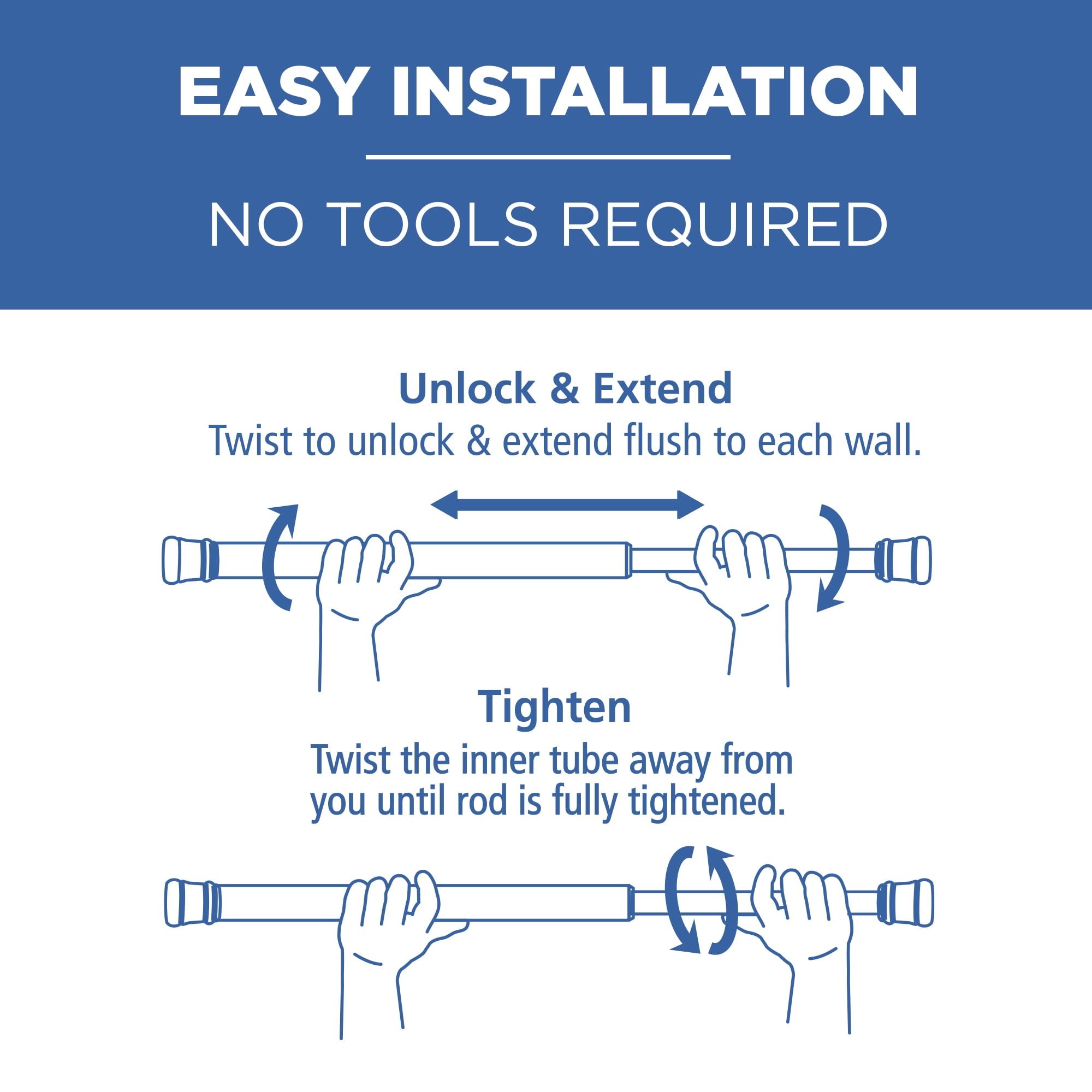 It's easy to upgrade your bathroom with the Mainstays Easy Hang Stall-Size Shower Curtain Tension Rod. This rugged steel shower rod is built to last and is easy to securely install, thanks to its tool-free tension mechanism. The rod adjusts from 27 to 40 inches to fit in smaller shower and tub spaces. The neutral white finish is chip and rust-resistant, with non-slip, non-scratch end caps that stay in place and won't damage walls or tile surfaces. Installation requires no tools and no drilling. To install, simply twist to unlock, extend and tighten in place.
