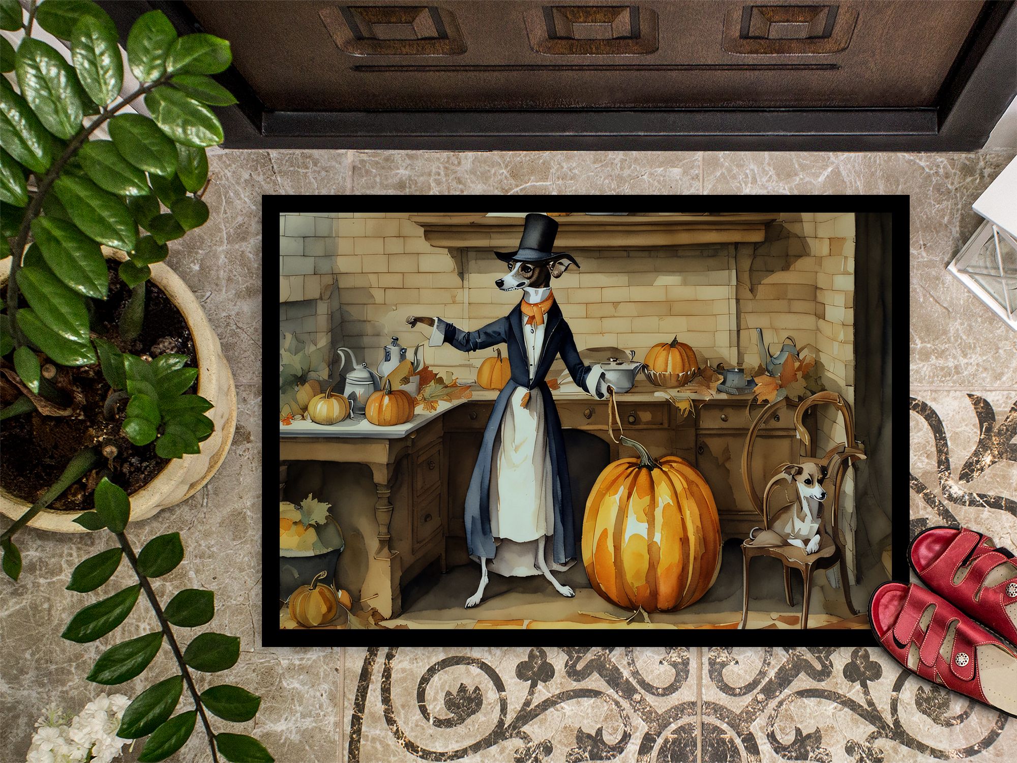 Doormat featuring breed specific Italian Greyhound artwork. Celebrate Halloween with this Halloween Doormat. Welcome your guests in style with our Artwork Door Mat, designed to withstand almost any weather condition. This mat, measuring approximately 18 by 27 inches, is held together by durable black binding tape. Its top layer, composed of polyester felt, is dyed with the eye-catching image you see on the mat. A few layers below provide the mat with stability, while its rubber bottom is stamped to help prevent slipping and ensures safety. Our mat works wonderfully as both an indoor or outdoor door mat. For cleaning, simply hose it off with water or use a power washer - no need for any cleaner that produces suds. Avoid scrubbing with a brush, instead, opt for the vacuum on floor setting. Designed manufactured and printed in the USA, this mat is a perfect addition to your porch, outdoor kitchen, entryway, or any indoor space. Its unique design makes it a charming decorative rug that greets your guests and adds a stylish touch to your home decor.