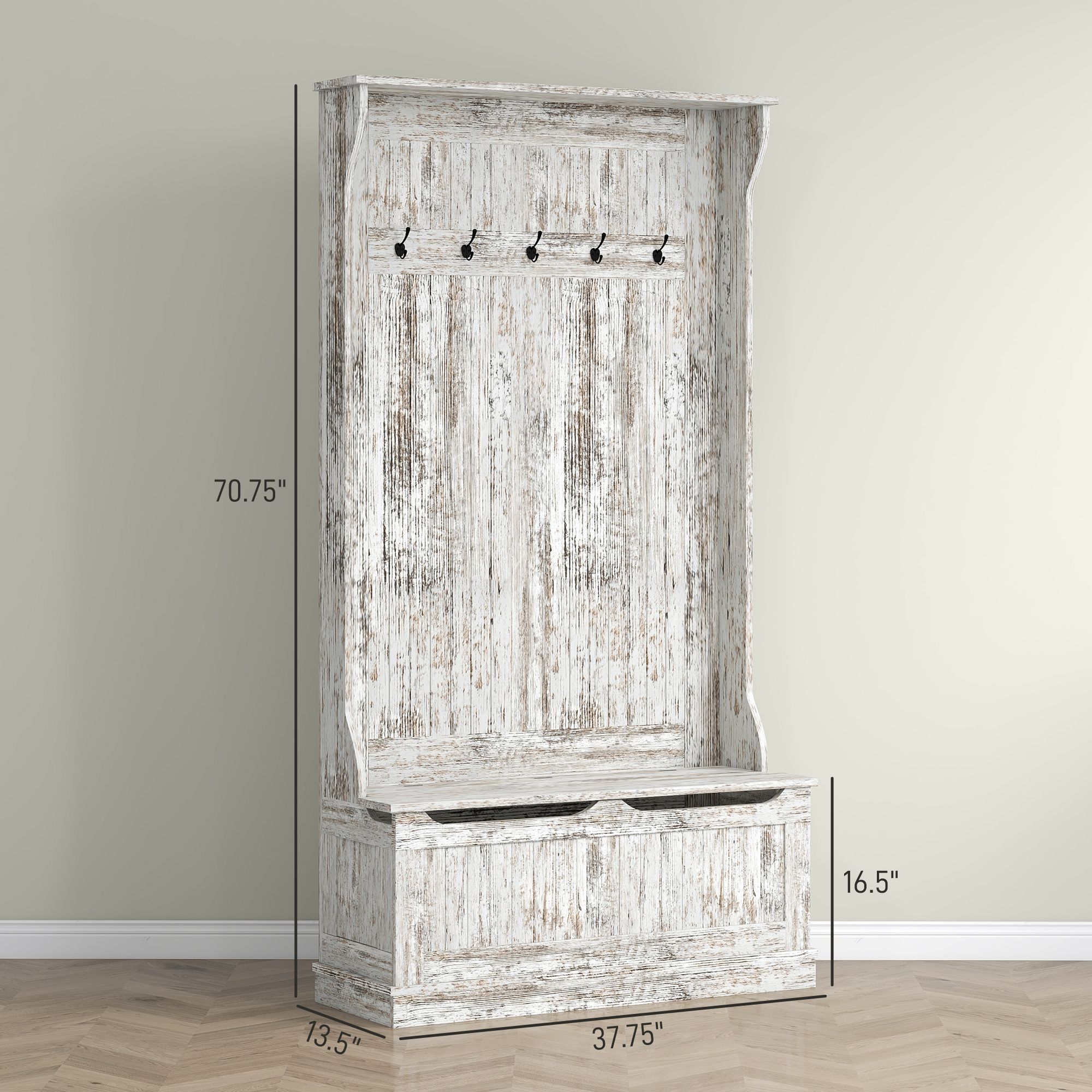 HOMCOM 3-In-1 Entryway Bench with Coat Rack, Hall Tree with Bench and Shoe Storage, 5 Hooks for Hallway Distressed White | Aosom